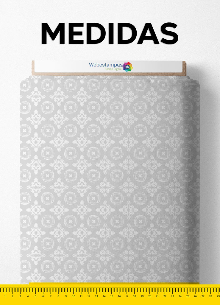 Tecido Cetim Estampa Digital Arabesco Branco Fundo Cinza 1,40m de Largura