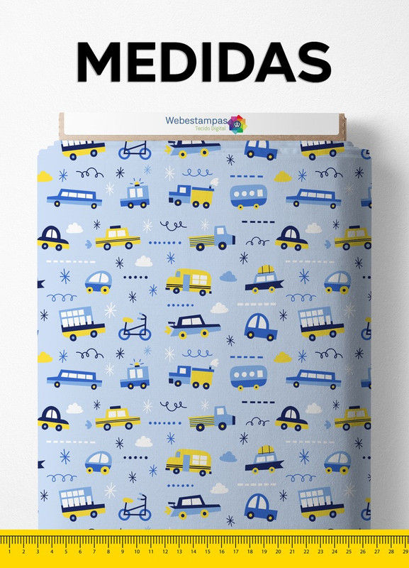 Tecido Cetim Estampa Digital Carrinhos Fundo Azul Bebê 1,40m de Largura
