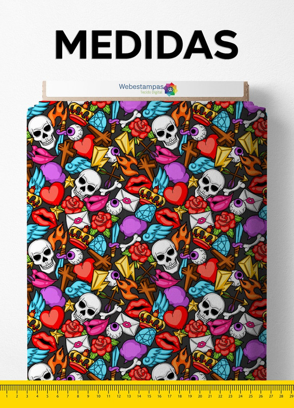 Tecido Cetim Estampa Digital Caveira Tatuagens Coloridas 1,40m de Largura