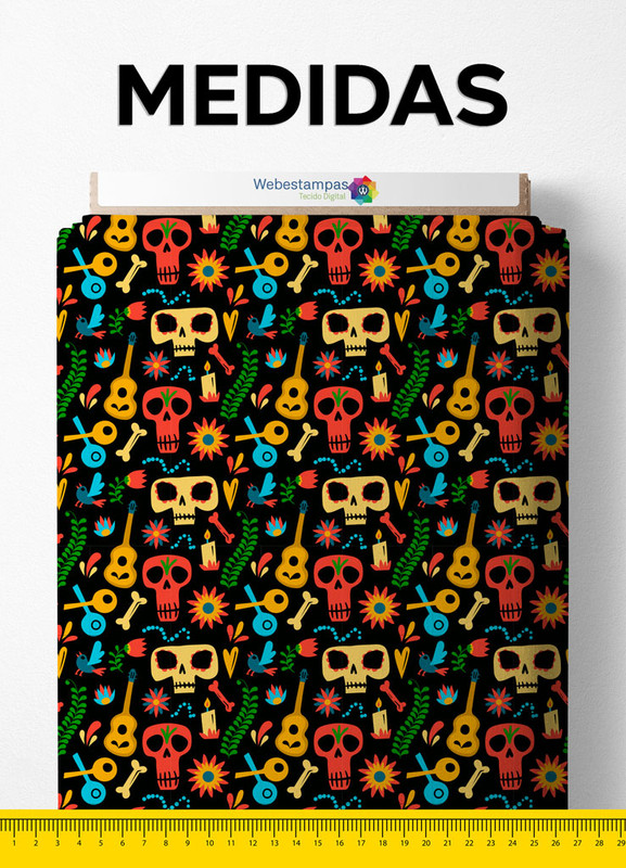 Tecido Cetim Estampa Digital Caveira Violão Mexicano 1,40m de Largura