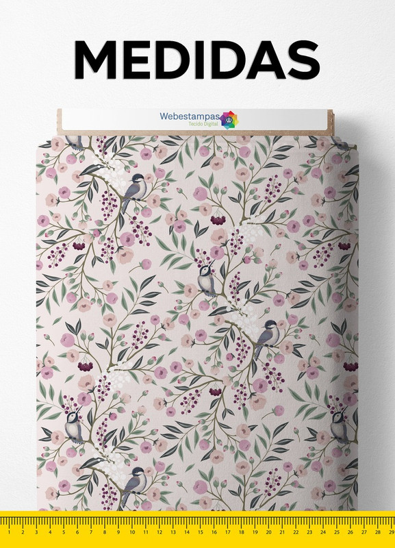 Tecido Cetim Estampa Digital Raminhos Verdes e Rosas 1,40m de Largura