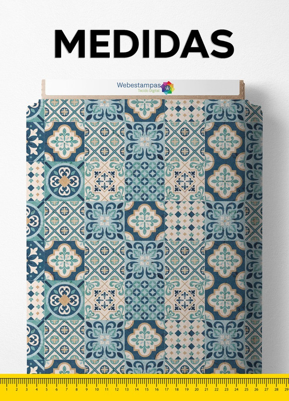 Tecido Helanca Estampa Digital Arabesco Azulejo Azul e Palha 1,55m de Largura