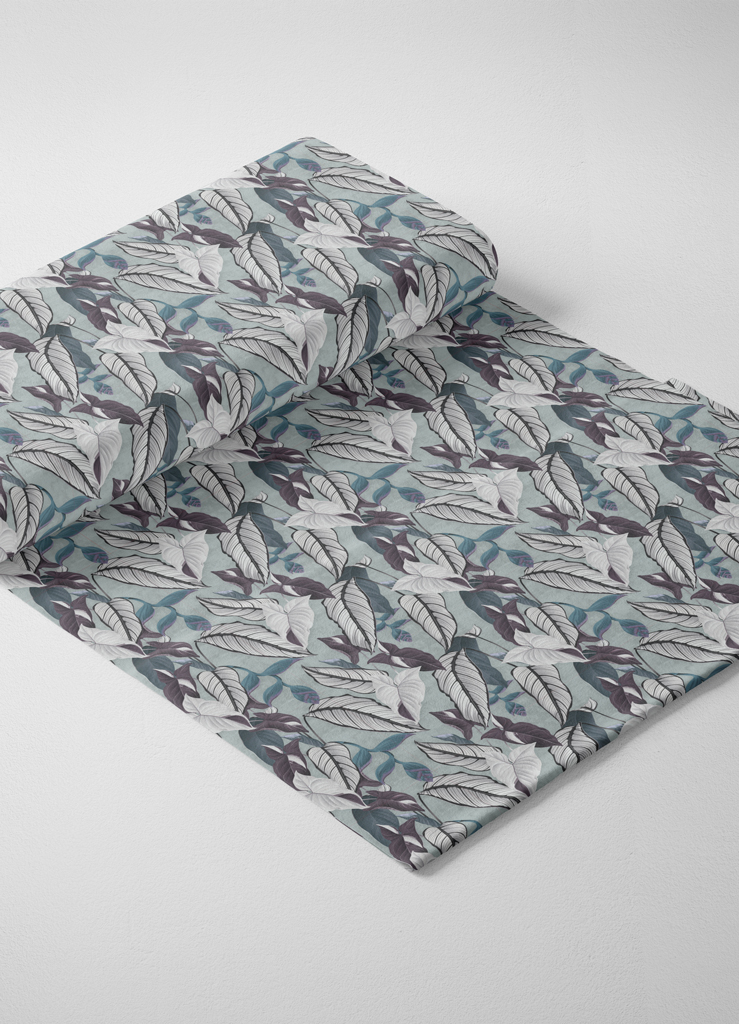 Tecido Helanca Estampa Digital Folhas Cinza Fundo Azul 1,55m de Largura