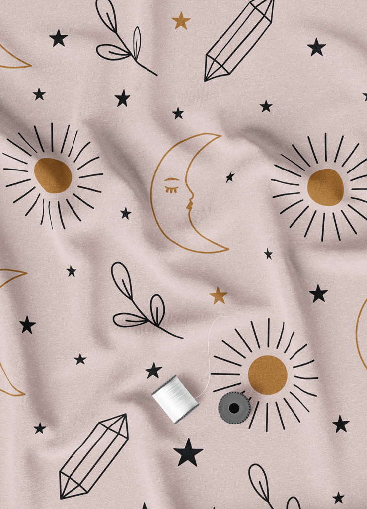 Tecido Helanca Estampa Digital Lua e Sol Dourado e Preto 1,55m de Largura