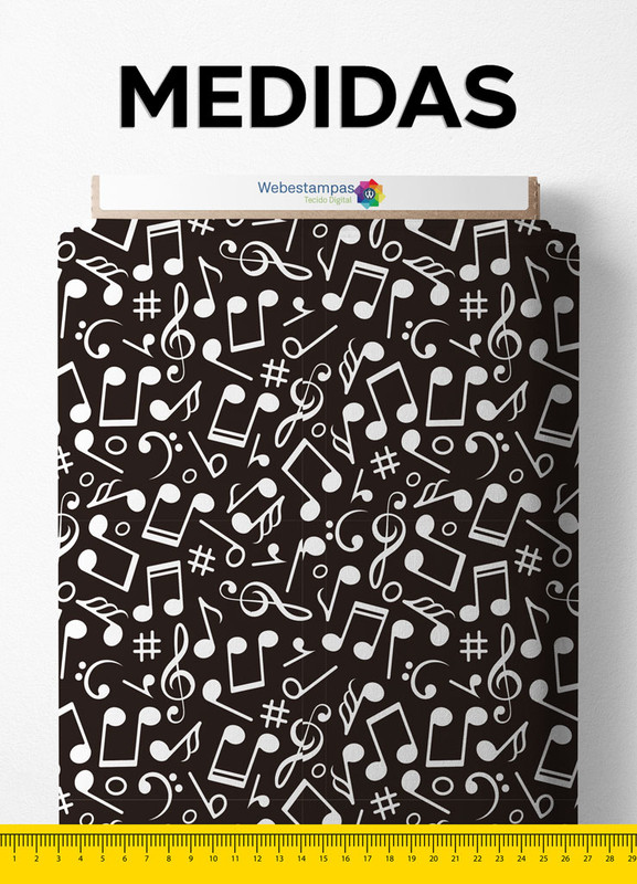 Tecido Helanca Estampa Digital Notas Musicais Branco Fundo Preto 1,55m de Largura