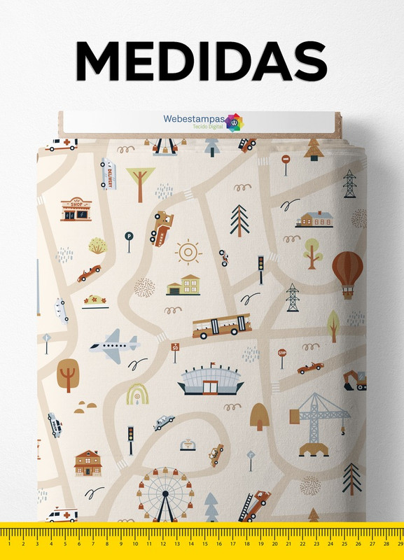 Tecido Malha 100% Algodão Fio 24 Estampa Digital Cidade Fundo Bege 1,50m de Largura