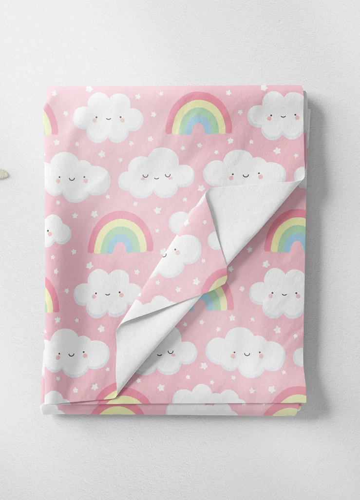 Tecido Microfibra Estampa Digital Arco-Íris e Nuvens Fundo Rosa 1,55m de Largura