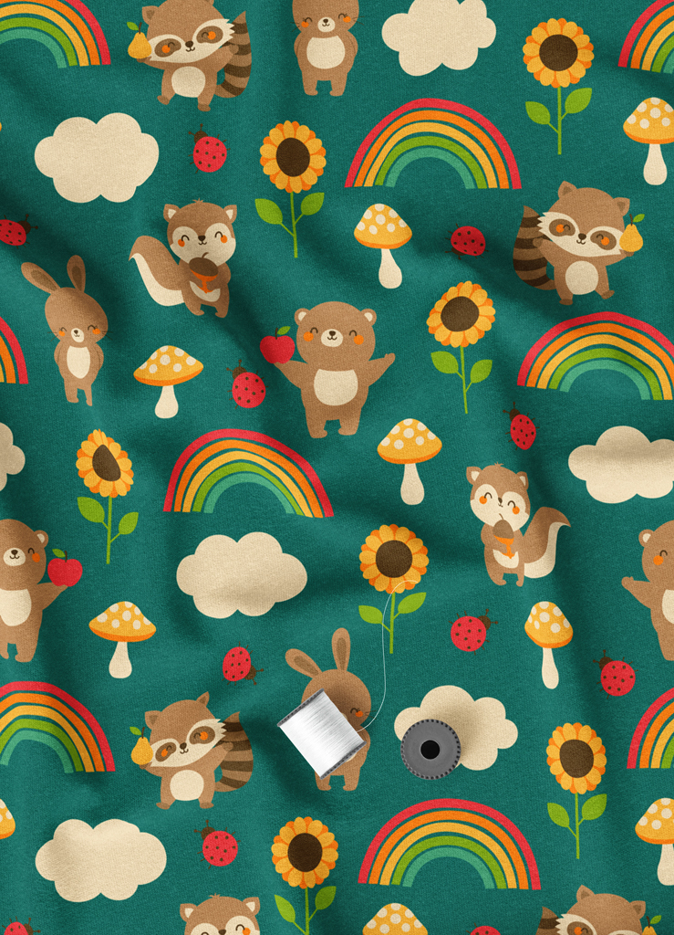 Tecido Microfibra Estampa Digital Bichinhos Arco-Írs Fundo Verde 1,55m de Largura
