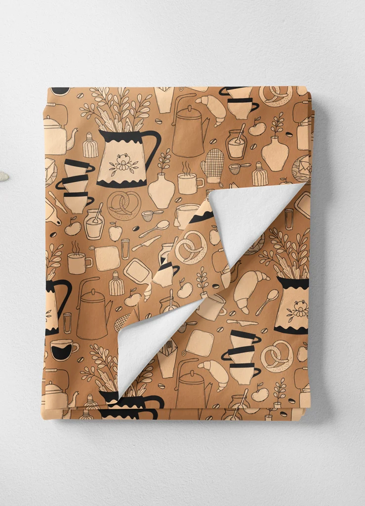 Tecido Microfibra Estampa Digital Café e Frutas Preto e Palha 1,55m de Largura
