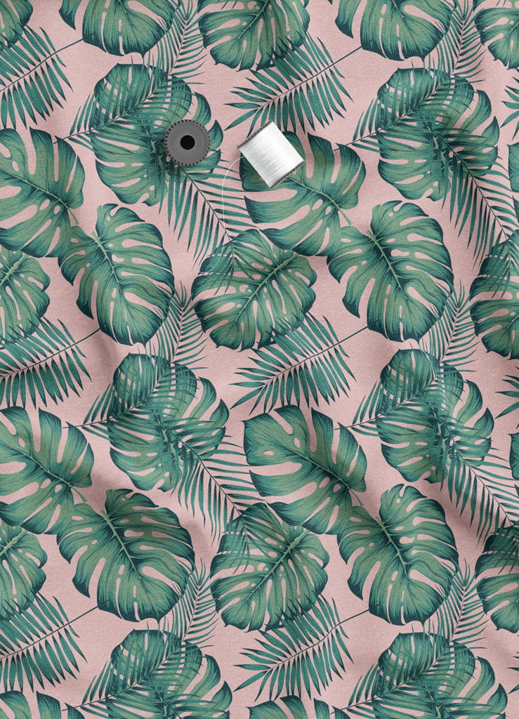 Tecido Microfibra Estampa Digital Folhas Verdes Fundo Rosa 1,55m de Largura