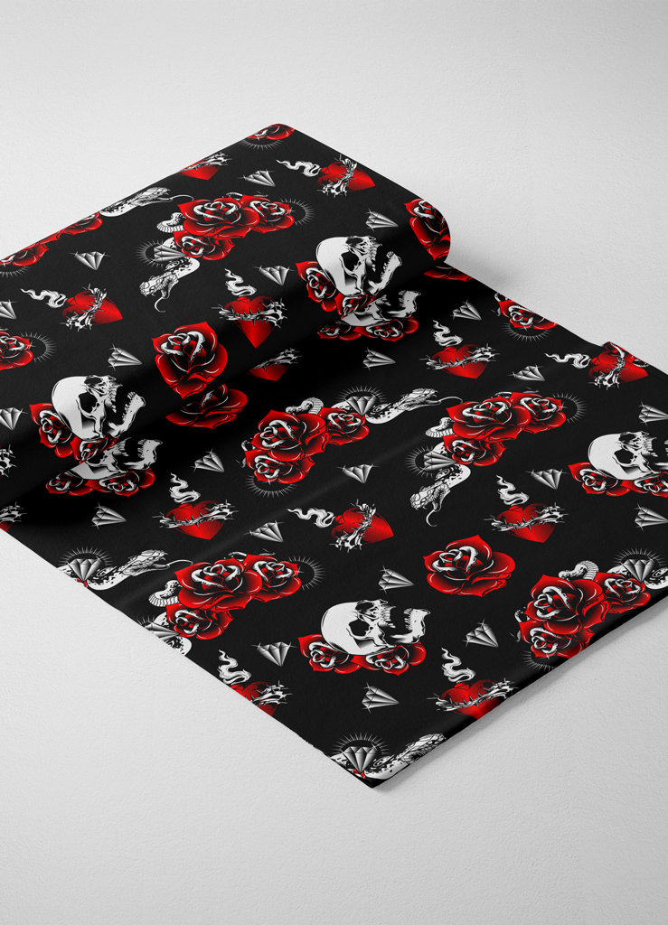 Tecido Tricoline Estampa Digital Caveiras e Rosas Fundo Preto 1,50m de Largura