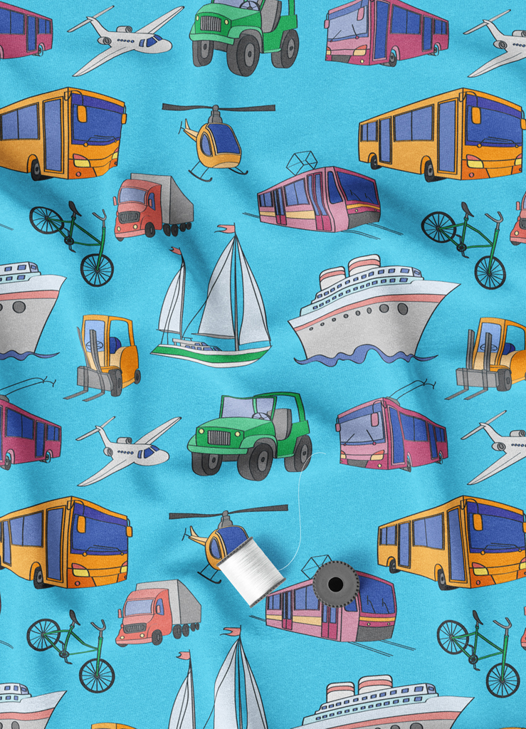 Tecido Veludo Suede Estampa Digital Transportes Fundo Azul 1,40m de Largura